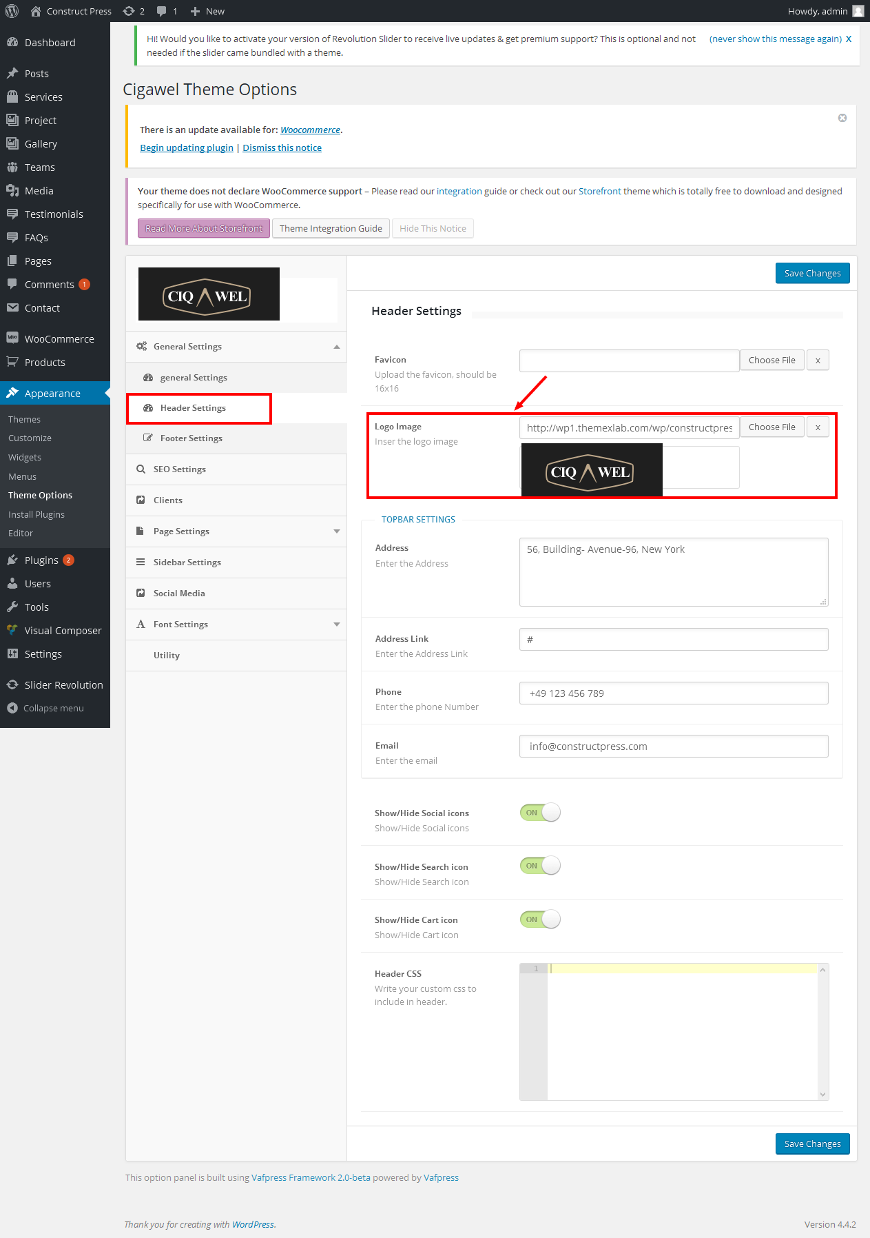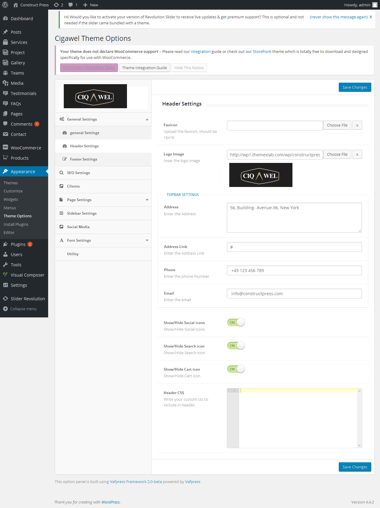 Header Settings: In header setting section you will see custom favicon and logo uploaders,logo with image, custom CSS options, Social Icons handler to enable or disable Icons, Search Icon handler to enable or disable search icon, Cart Icon handler to enable or disable cart icon and much more.
