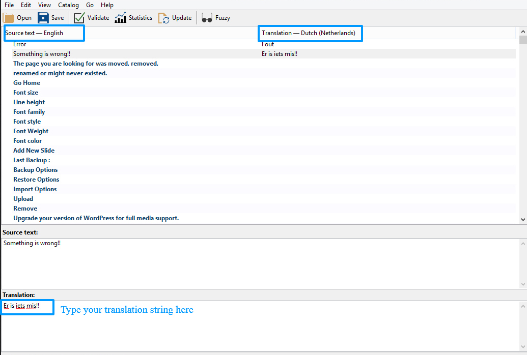 - Once done with your translations, Save the file. The updated .mo file will be auto created.