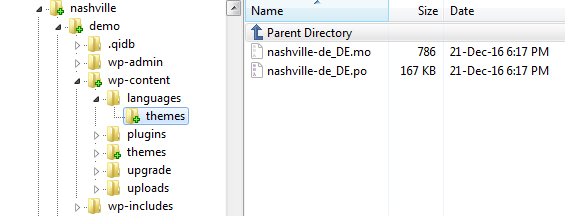 When storing your language files, remember that the file structure is different and must include the theme name, as well. For example, if the language files are in the Deutsch language, the file names would be nashville-de_DE.po and nashville-de_DE.mo.