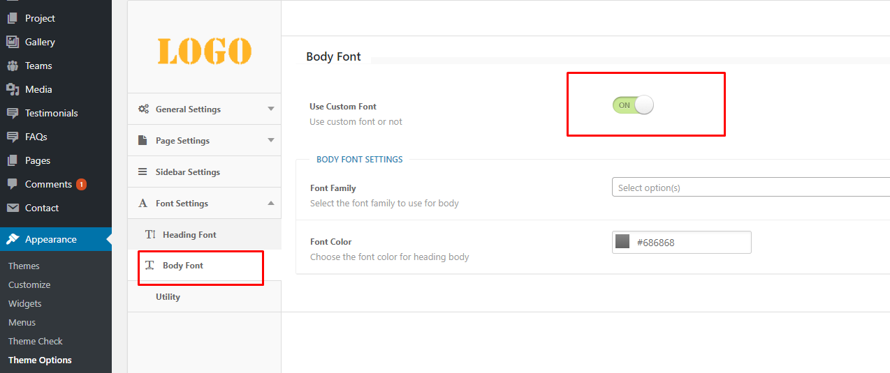 Font Settings: In this option you will see, custom font options. For example you can change all heading fonts, colors and all body fonts and colors, sizes etc.
