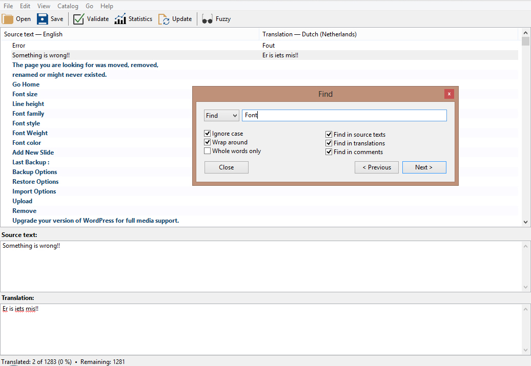 - Once done with your translations, Save the file. The updated .mo file will be auto created.