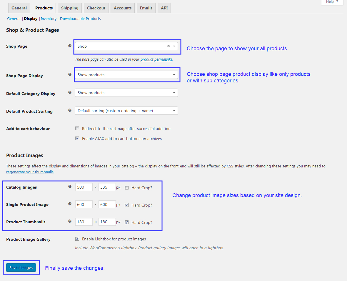 Here you can select the page, choose whether you show categories or products on the main shop page, the default sorting, and more.